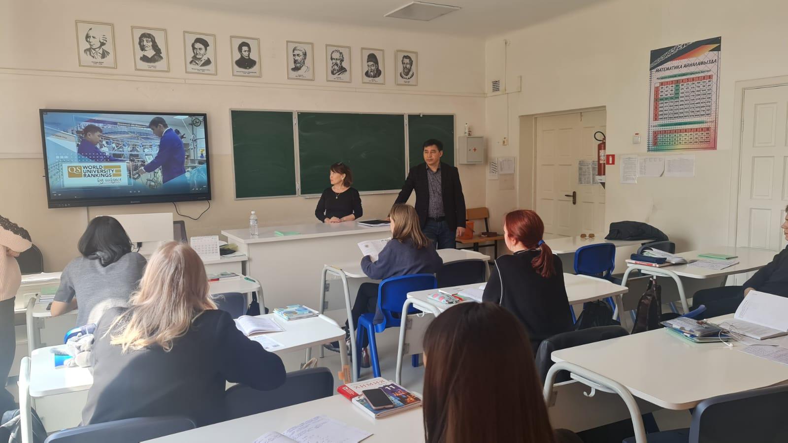 Сегодня 27 апреля текущего года представителями Казахский агротехнический университет им С. Сейфуллина были посещены выпускные классы нашей школы. Входе беседы учащиеся узнали про приоритетные секторы КазАТУ: «Сельскохозяйственное машиностроение», «Производство пищевых продуктов». В университете работают 44 кафедры. С 2012 года в Казахском агротехническом университете им. С.Сейфуллина в числе первых 20 вузов РК реализуется программа полиязычного образования.