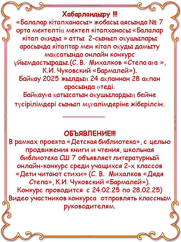 «Балалар кітапханасы» жобасы аясында № 7 орта мектептің мектеп кітапханасы «Балалар кітап оқиды » атты 2-сынып оқушылары арасында кітаптар мен кітап оқуды дамыту мақсатында онлайн конкурс ұйымдастырады.(С. В. Михалков «Степа аға », К.И. Чуковский «Бармалей»).