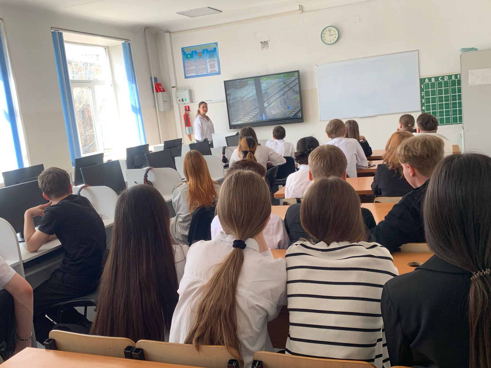 «Қазақстан темір жолы» ұлттық компаниясы» акционерлік қоғамының филиалы – «Магистральдық желі бөлімшесі» – Семей бөлімшесі әзірлеген бейнематериалды көрсете отырып, оқушылар арасында түсіндіру жұмыстары жүргізілді.